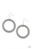 An edgy strand of silver chain wraps around a silver ring, coalescing into a bold industrial hoop. Earring attaches to a standard fishhook fitting.