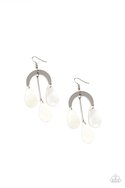 White shell-like teardrops trickle from the bottom of a silver rod and silver half moon frame, creating an ocean inspired chandelier. Earring attaches to a standard fishhook fitting.