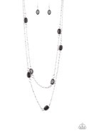 Glassy black beads are threaded along metallic rods, allowing them to spin inside their silver fittings. The colorful frames trickle along two shimmery chains across the chest for a refined layered look. Features an adjustable clasp closure.