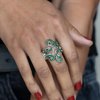 Glistening silver bars and green rhinestone encrusted bars delicately swirl across the finger, billowing into a sparkly centerpiece. Features a stretchy band for a flexible fit.