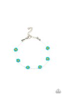 Bright turquoise blue flowers circle around a white beaded bracelet for a crafty summer camp vibe. Features an adjustable clasp closure.