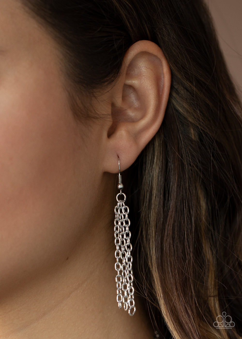 Featuring hammered finishes, two asymmetrical silver rings dangle from the bottom of a lengthened silver chain for a rustic look. A lobster clasp hangs from the bottom of the design to allow a name badge or other item to be attached. Features an adjustable clasp closure.