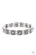 Dotted with iridescent blue rhinestone centers, studded silver frames alternate with pairs of dainty silver beads along stretchy bands, creating a stellar centerpiece around the wrist.