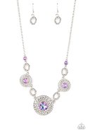 Airy silver petals delicately bloom inside twisted silver hoops below the collar. Dotted with iridescent purple rhinestone centers, the flowery frames gradually increase in size as they link with twisted silver oval rings and glittery purple iridescent rhinestones for an out-of-this-world statement. Features an adjustable clasp closure. Due to its prismatic palette, color may vary.