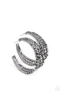 Cascading layers of smoldering hematite rhinestones plunge into flattened gunmetal plates creating a stunning eye-catching hoop earring. Earring attaches to a standard post fitting. Hoop measures approximately 2" in diameter.