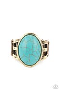 An oval turquoise stone is nestled inside an antiqued brass frame that attaches to layered brass bands, creating a rustic stone centerpiece atop the finger. Features a stretchy band for a flexible fit.