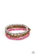 Vivacious pink stone beads, wooden beads, and silver antiqued beads are threaded along elastic stretchy bands. Sprinkled between the colorful beads are dainty silver-studded flower beads for a whimsical finish.