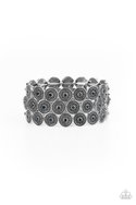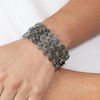 Dotted with dainty blue rhinestone centers, studded silver discs haphazardly stack into trios that have been threaded along stretchy bands around the wrist for a whimsical finish.