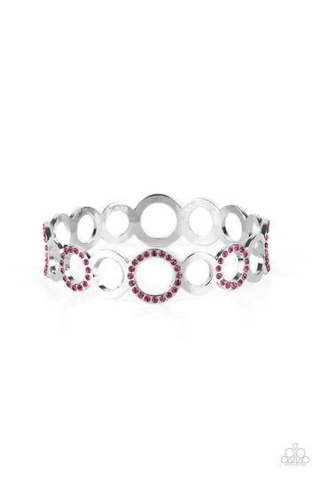 A glittery collection of sparkly pink rhinestone encrusted rings and shiny silver hoops coalesce into an airy bangle around the wrist.