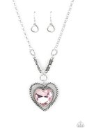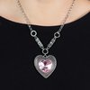 Bordered in spun silver ribbons, an oversized Gossamer Pink heart gem is pressed into a silver heart frame below the collar. The flirtatious pendant attaches to silver rings and decorative silver frames dotted in white rhinestones, resulting in a dash of vintage inspired romance. Features an adjustable clasp closure.
