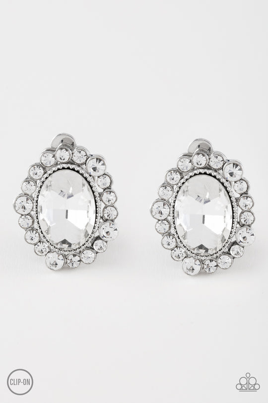 Varying in size, dainty white rhinestones spin around a faceted white gem for a timeless look. Earring attaches to a standard clip-on fitting.