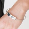 Engraved with the inspiring word "Hustle", a shimmery silver plate attaches to a skinny silver bar, creating a dainty bangle.