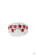 Encased in sleek silver fittings, a cluster of glittery red rhinestones coalesce inside an airy silver band encrusted in haphazard sections of glassy white rhinestones for a modern fashion. Features a stretchy band for a flexible fit.