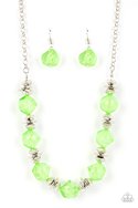 Flanked by faceted silver beads, shiny silver discs alternate with faceted and icy green beads along an invisible wire. Attached to a classic silver chain, the whimsical display creates a crackling pop of color below the collar. Features an adjustable clasp closure.