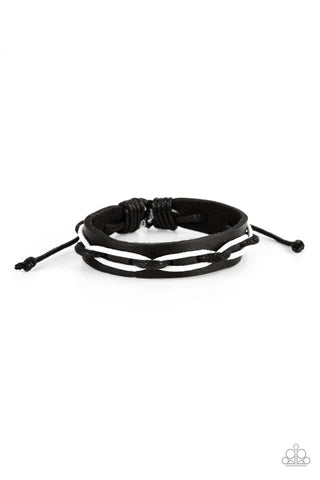 Black and white cording is interwoven across the top of a black leather band creating an edgy crisscrossed motion as it travels around the wrist. Features an adjustable sliding knot closure.