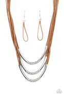An edgy collection of silver rods and silver rings glide along strands of shiny brown cording across the chest, resulting in an urban industrial display. Features an adjustable clasp closure.