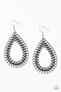 Antiqued chain links spin around a row of glittery hematite rhinestones, coalescing into an edgy silver teardrop. Earring attaches to a standard fishhook fitting.