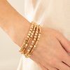Lightweight and flirty, two strands of golden square beads interspersed with gold cylinders, are paired with two strands of gold cubes. The four stretchy bracelets come together to create an irresistible stack of metallic mayhem.