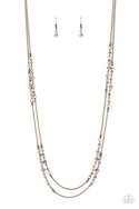 Sections of aurum and iridescent crystal-like beads embellish strands of dainty brass beaded chains, resulting in prismatic layers across the chest. Features an adjustable clasp closure.