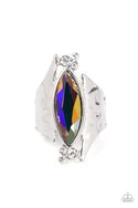 An oversized marquise cut iridescent gem asymmetrically balances between two flared and hammered silver frames. Clusters of dainty white rhinestones flanks the spellbinding centerpiece for a delicate finish. Features a stretchy band for a flexible fit.