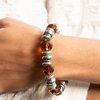 An oversized assortment of textured silver rings, smooth silver beads, and brown crystal-like beads are threaded along stretchy bands around the wrist for a glitzy finish.