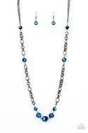 Featuring an oil spill iridescence, faceted metallic blue beads adorn sections of chunky gunmetal chains across the chest for a gritty glamorous fashion. Features an adjustable clasp closure.