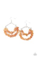 Attached to shimmery silver chains, a refreshing collection of orange pebble-like stones are threaded along two dainty silver wires, layering into an earthy teardrop. Earring attaches to a standard fishhook fitting.