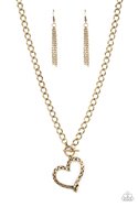 A hammered brass heart frame gently twists from a toggle closure at the bottom of a chunky brass chain, resulting in a romantically rustic pendant. Features a toggle closure.