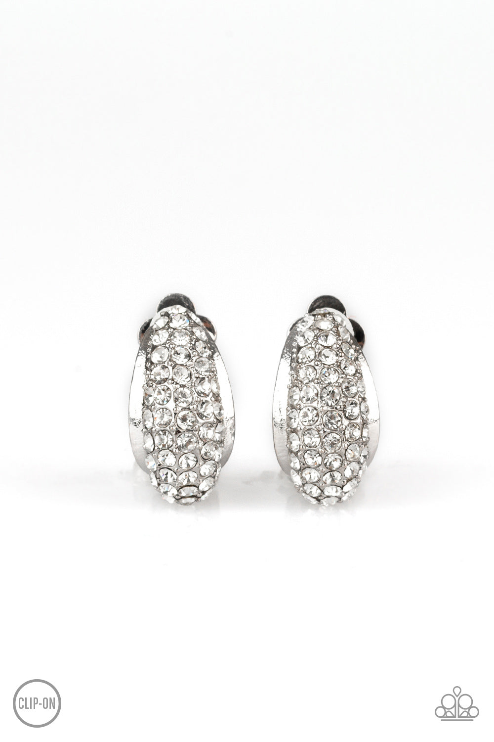 A glistening silver frame is encrusted in row after row of glassy white rhinestones for a timeless look. Earring attaches to a standard clip-on fitting.