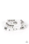 A mismatched assortment of glassy and opaque white beads joins white crystal-like and dainty silver accents along stretchy bands around the wrist, resulting in dreamy layers.