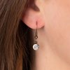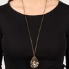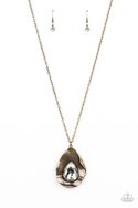 A warped brass frame gently folds around an oversized white teardrop gem center, resulting in a gritty yet glamorous pendant at the bottom of a lengthened brass chain. Features an adjustable clasp closure.