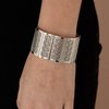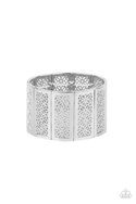 Filled with airy stenciled floral patterns, rectangular silver frames are threaded along stretchy bands around the wrist, creating a whimsical centerpiece.