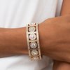 A glassy white rhinestone is pressed into a ring of glitzy white rhinestones inside a rectangular gold frame dusted in dazzling white rhinestones. The timeless frames sparkle along stretchy bands around the wrist, resulting in a glamorously glittering centerpiece.