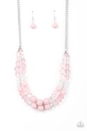 Featuring white, iridescent, and Gossamer Pink, mismatched sections of glassy, crystal-like, and acrylic beads are threaded along invisible wires below the collar. Suspended from the bottom of a shiny silver chain, the colorful layers twinkle and shimmer in the light. Features an adjustable clasp closure.